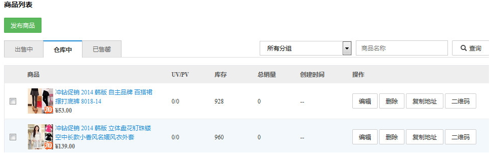 倉庫中的商品:商品列表頁,可以發(fā)布商品、根據(jù)分組或商品名稱進(jìn)行查詢、對(duì)商品進(jìn)行批量上架和刪除、對(duì)商品進(jìn)行編輯、刪除、復(fù)制商品地址、查看商品二維碼