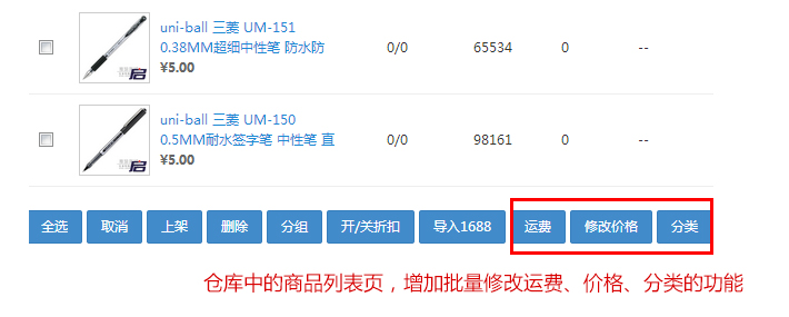 倉庫中的商品列表頁,增加批量修改運(yùn)費(fèi)、價(jià)格、分類的功能