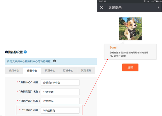 ①商家可以自定義不符合商品分組權(quán)限條件的提示語(yǔ)