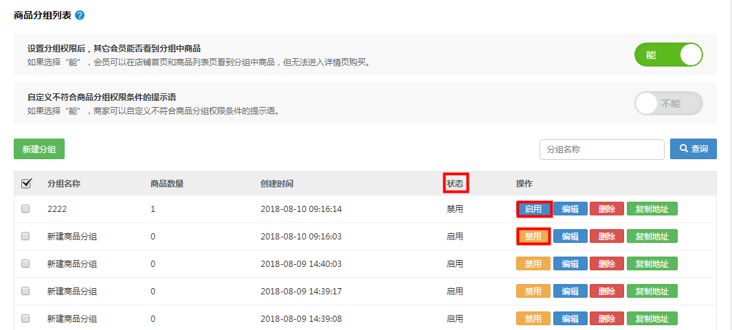 商品分組增加“禁用”、“啟用”按鈕,商品分組列表新增“狀態(tài)”顯示。禁用后,商品編輯添加選擇分組不顯示, 手機(jī)端商品展示不會(huì)因?yàn)榉纸M條件限制而不展示商品