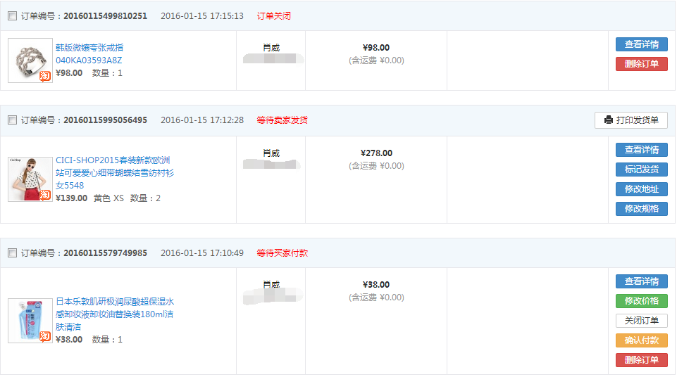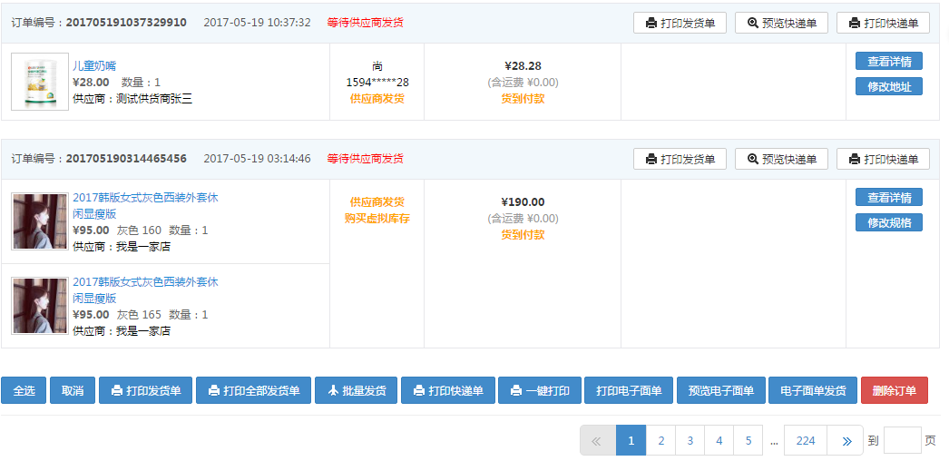 訂單列表中,可以清楚的查看訂單的詳細信息、發貨單的打印、修改地址等操作,具體如下圖所示: