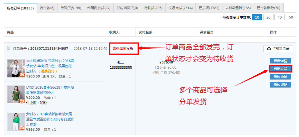 ·待發貨的訂單列表如下,根據需求可進行批量操作。