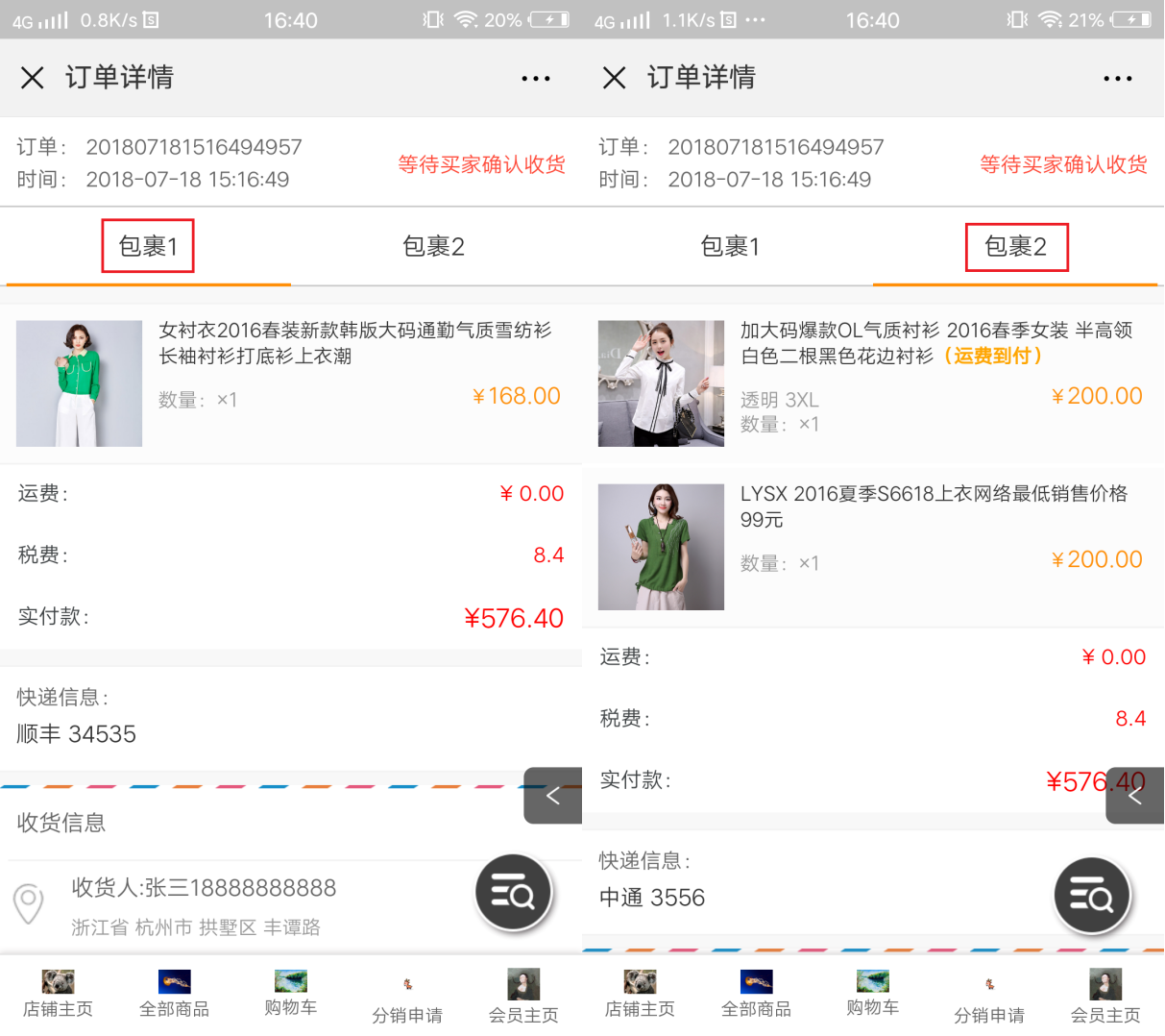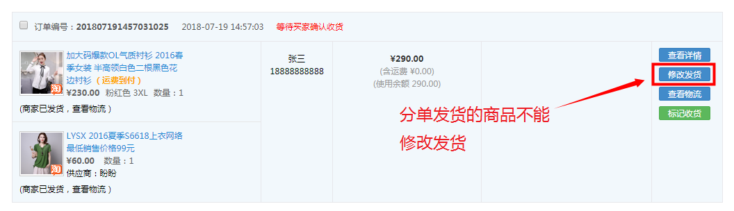 操作步驟:訂單可以選擇分單發貨,一筆訂單可以有多個物流單號,同時手機端會相應生成不同的包裹。只有訂單商品全部發完,訂單狀態才會變為待收貨。(注:當供應商發貨的開關開啟時,訂單中的供應商商品將不在分單發貨中顯示,供應商商品只能由供應商進行發貨操作)
