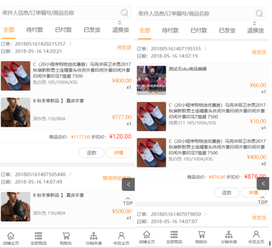 1.會員列表顯示所有注冊店鋪的會員信息,用戶可以根據上面的查詢條件手機號碼、微信昵稱、注冊時間等進行查詢;會員列表中針對某個會員可以查看會員詳情,編輯會員信息,將會員設置為分銷商,批量設置等級和分銷商等操作。