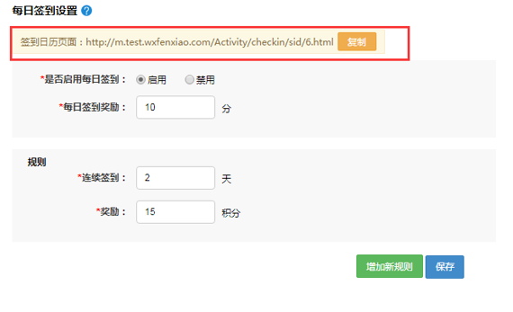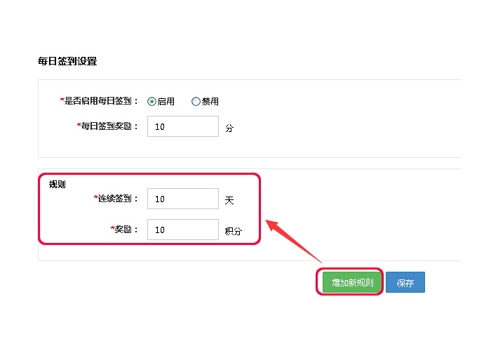 設置是否啟用每日簽到和每日簽到獎勵。還可以增加新規(guī)則,例如:連續(xù)簽到10天,獎勵10積分。點擊保存,每日簽到就設置完成了