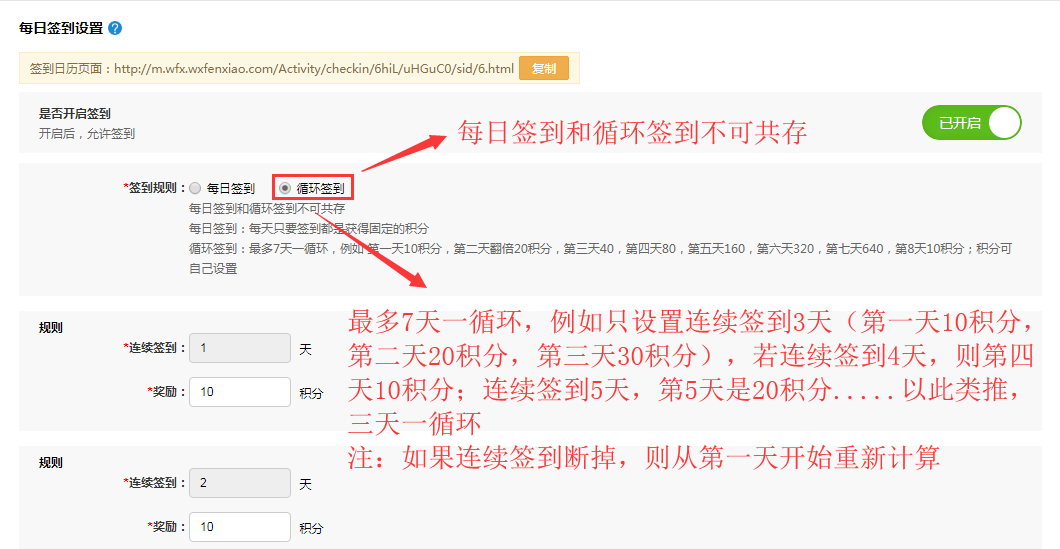 每日簽到新增“循環(huán)簽到”,可以設置連續(xù)簽到幾天送多少積分(可自己設置),最多7天一循環(huán)(例如只設置連續(xù)簽到3天,即第一天10積分,第二天20積分,第三天30積分),若連續(xù)簽到4天,則第四天10積分;連續(xù)簽到5天,第五天是20積分......以此類推,三天一循環(huán))。注:每日簽到和循環(huán)簽到不可共存;如果連續(xù)簽到斷掉,則從第一天開始重新計算。