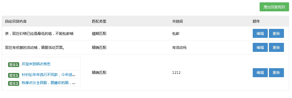 可進行的操作有,增加回復規則、編輯回復內容、刪除回復內容