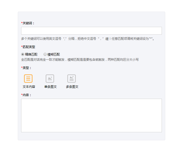 選擇增加回復規則,填入關鍵詞、選擇匹配類型、類型,自動回復添加完成。下框的內容是文本內容,單條圖文與多條圖文在素材庫中添加。