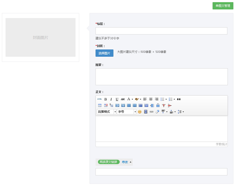 添加單條圖文,需要填入標(biāo)題、封面、摘要、正文、選擇鏈接地址,點(diǎn)擊保存素材,單條圖片就添加完成了。這里的單圖文管理按鈕,是到單圖文列表