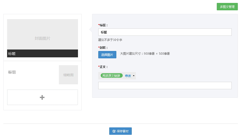 添加多條圖文,需要填入標(biāo)題、封面、正文、鏈接地址,點(diǎn)擊保存素材,多條圖文就添加完成了。這里的多圖文管理按鈕,是到多圖文列表。