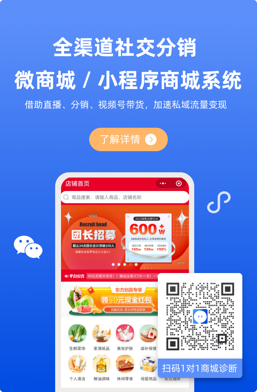社群團購 + 新零售方案 + 跨境電商分銷 + 視頻號分銷方案 + 私有化企業定制方案,更多專業方案免費獲取……