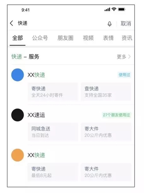 而后,“搜一搜”正式開放服務搜索接入,可直達對應小程序。即凡滿足條件的商家在公眾號后臺配置“服務搜索”后,相關小程序服務就有機會在搜索中展示。從網上流傳出的微信產品內測圖來看,搜一搜結果頁會將小程序服務置頂、細分服務直接露出。
