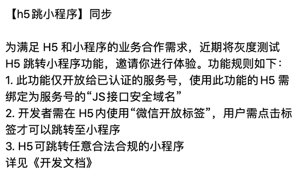 據介紹,該功能的意思是,原本企業常用的H5消息可綁定小程序,而后,當用戶點擊H5消息即可直接跳轉到對應的小程序中。“也就是說,點擊App內的H5鏈接可以直接跳轉到小程序,微信里的H5鏈接也可以跳轉到小程序(以前只能跳轉到瀏覽器相關頁面)。”其中一位開發者補充道。