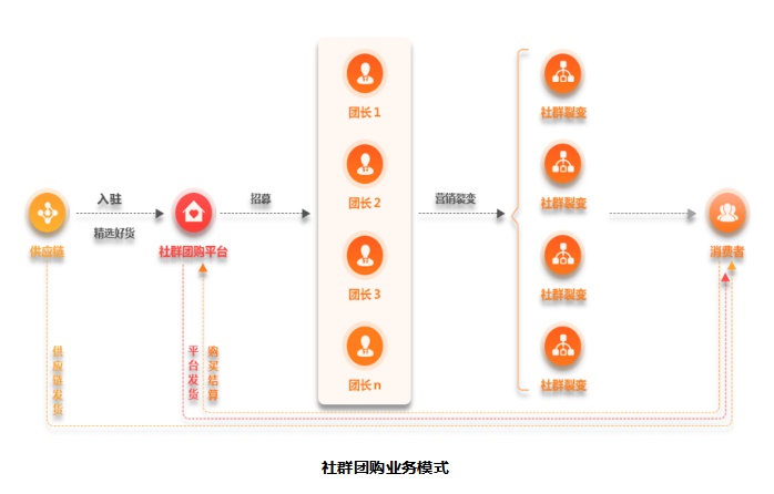 社群電商作為社交新零售創(chuàng)新模式之一,商家與用戶之間實現(xiàn)直接零距離溝通,通過好友關系以及二度、三度甚至完全陌生的關系和人脈不斷建立新的鏈接紐帶,借助社交強關系達到銷售目的,品牌方通過團長進行裂變分銷。