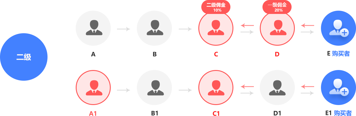 1、商品的價格200元 E購買 D40元 C20元 B不拿,因為主要下單人是誰,往上推二級。
