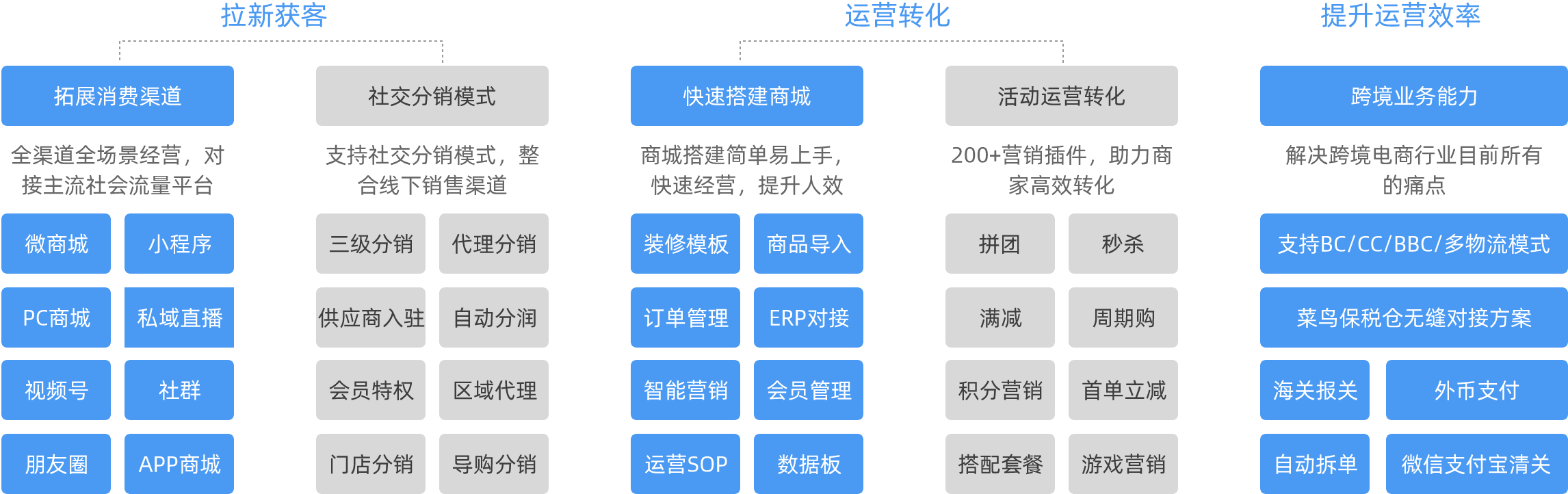 社群團購 + 新零售方案 + 跨境電商分銷 + 視頻號分銷方案 + 私有化企業定制方案,更多專業方案免費獲取……